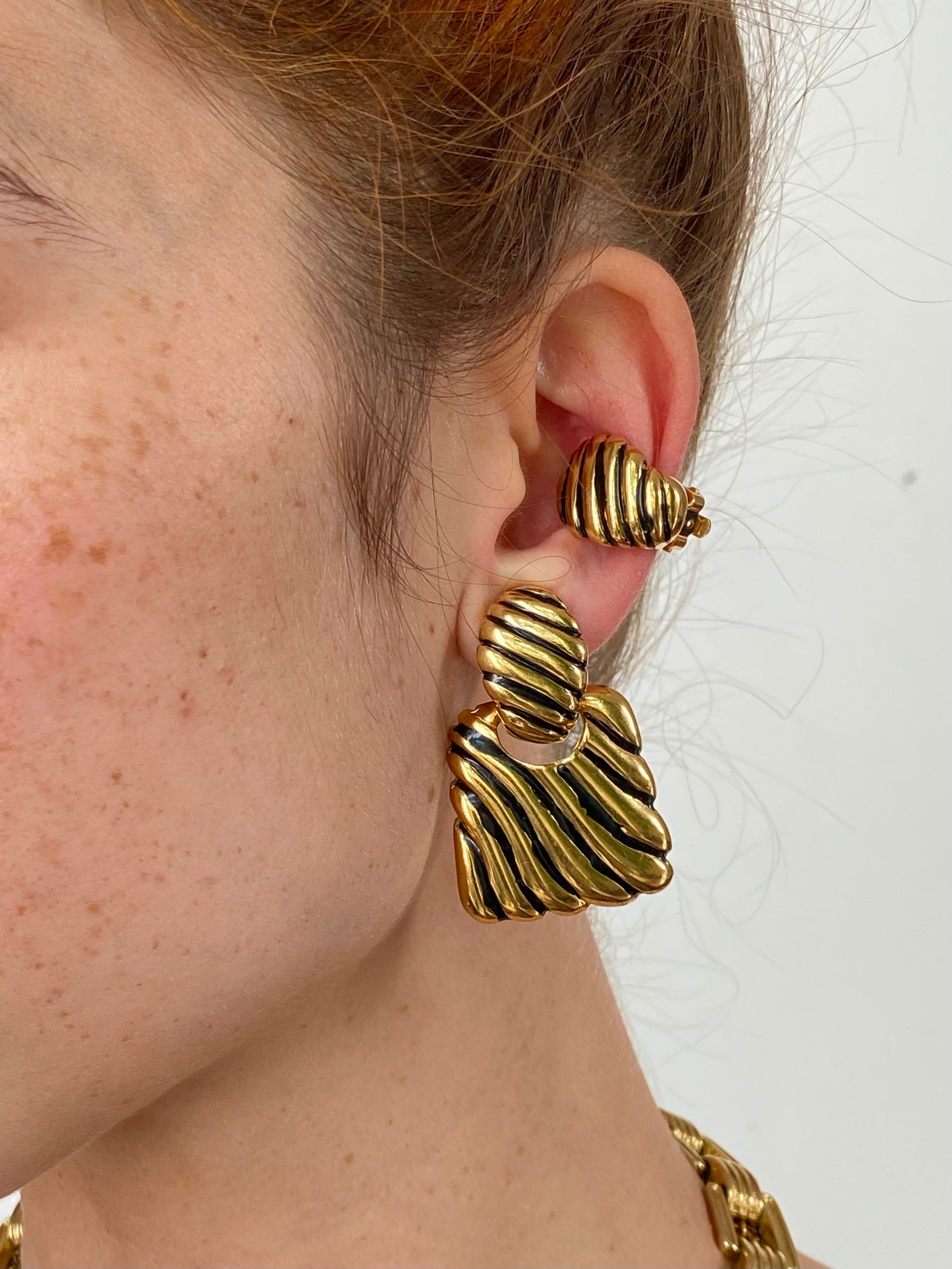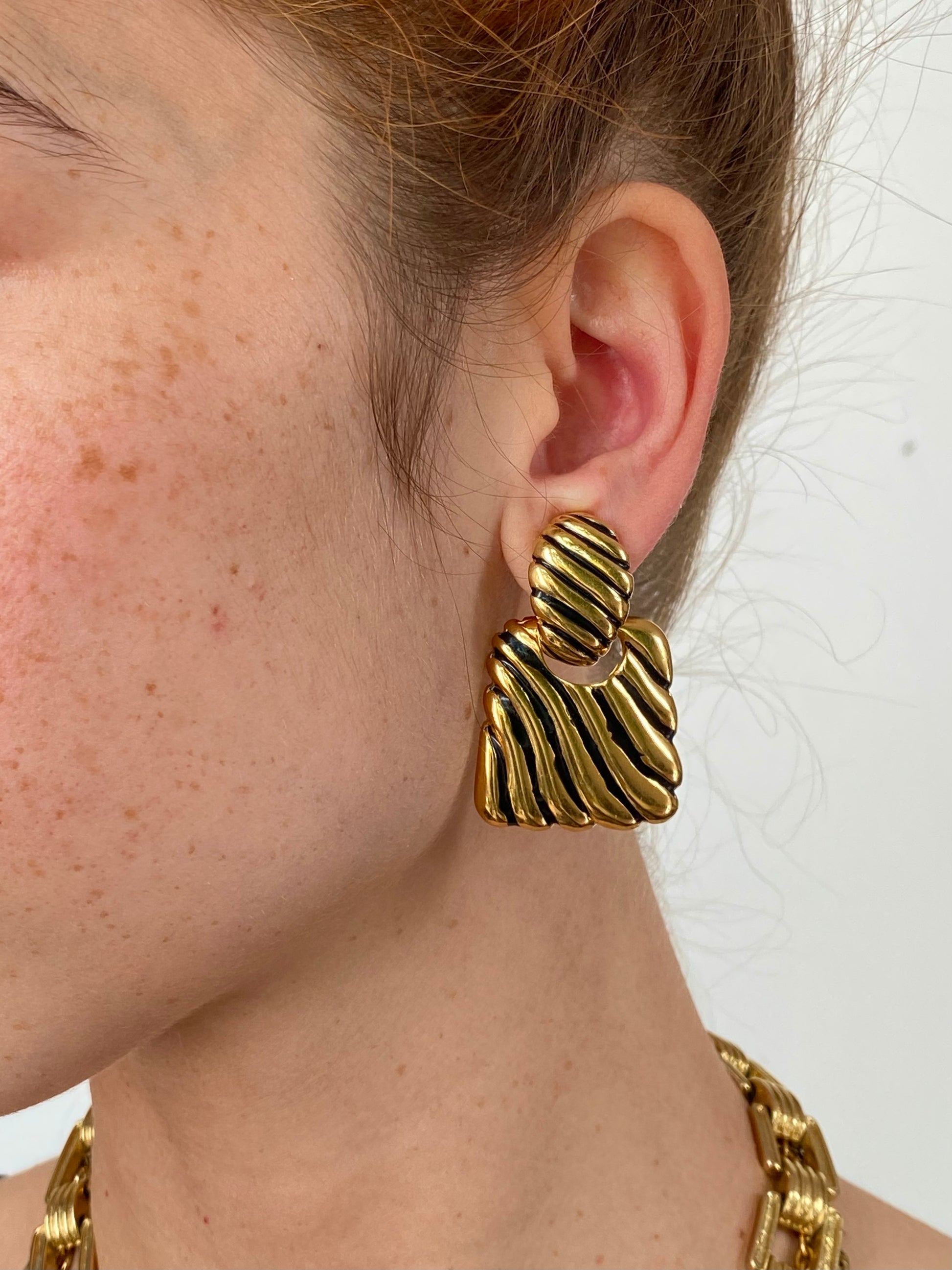 Sublimes clips plaqué or signés Carita. De la patine (pâte noire utilisée en bijouterie) a été mise à certains endroits pour faire ressortir les reliefs. So chic!