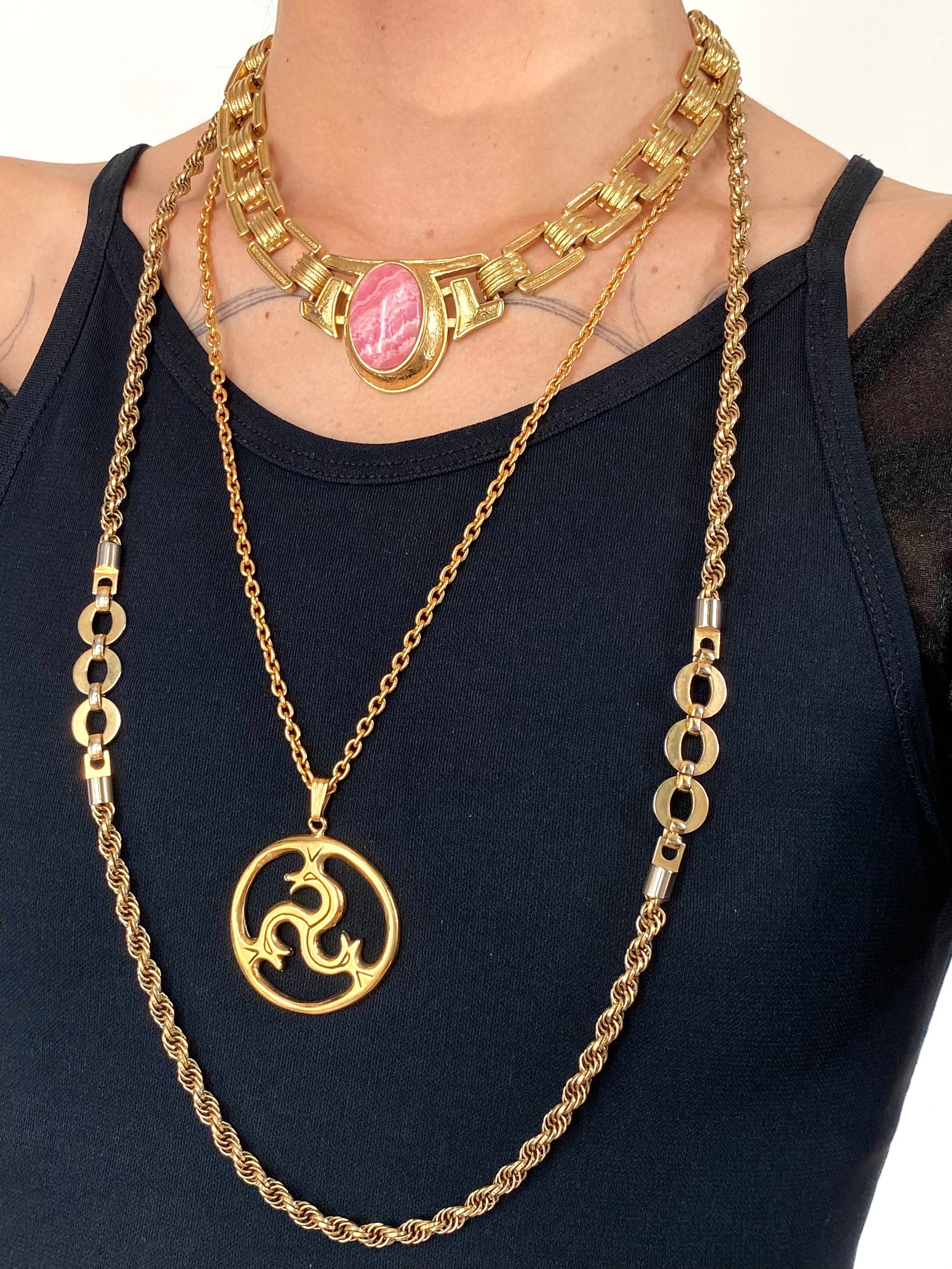 Sublime ras de cou en laiton doré et cabochon de rhodochrosite. Finition "piqué" sur les maillons, ce qui donne encore plus de caractère au collier.